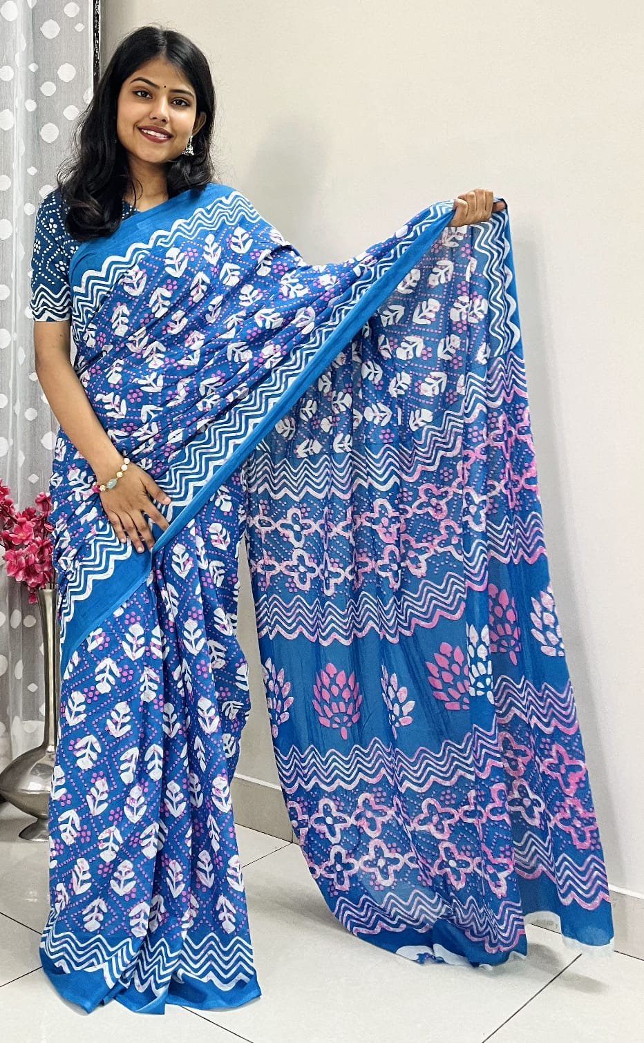 Cotton mulmul saree Hand block print All saree with same designer blouse Saree lenght 5.50 Blouse lenght .80cm
