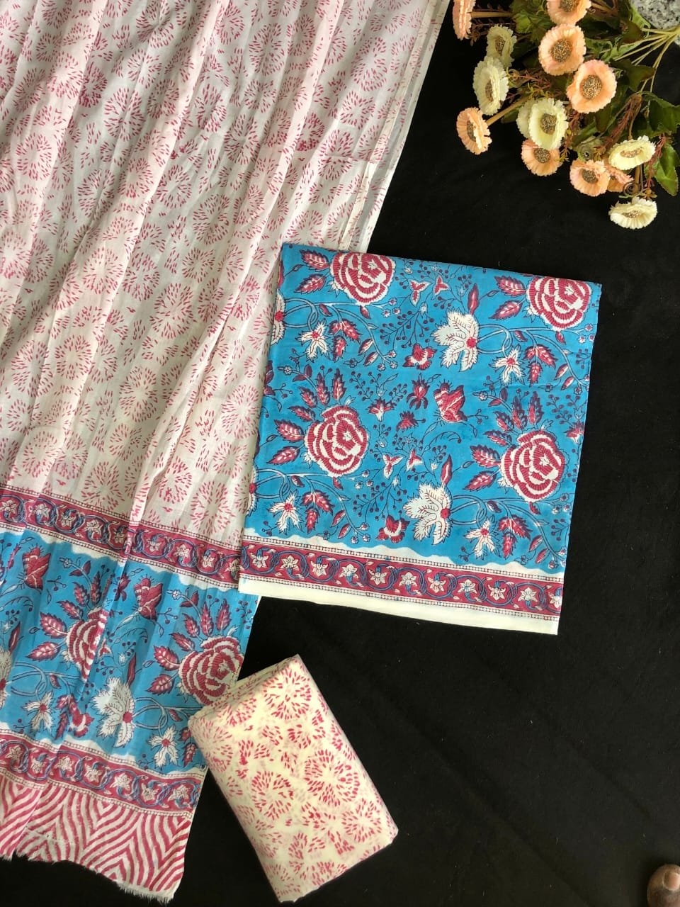 Exclusive new hand block printed cotton suits with cotton duptta?? Details?? Top fabric - cotton 2.5 mtrs Bottom fabric - cotton 2.5 mtrs Duptta fabric - cotton 2.5 mtrs Super quality fabric Febric 60*60